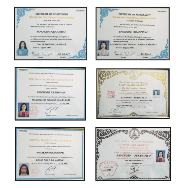 We all have massage qualifications from Thailand that are internationally recognised. Click on the certificates for a closer view.